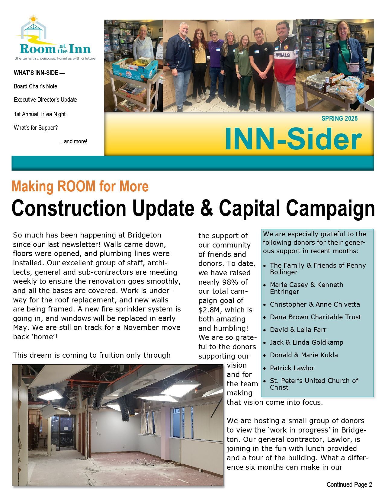 We are also grateful to our late, former beloved Executive Director, David Weber, for envisioning what Room at the Inn can be. We are blessed by Laurie Phillips, our Executive Director, and our wonderful Board of Directors for their continued vision and unwavering support of the project. We are thankful to Lawlor Corporation, our contractor, and our architects, HKW for their strong partnership and execution. Everyone enjoyed lunch thanks to Lawlor Corporation.